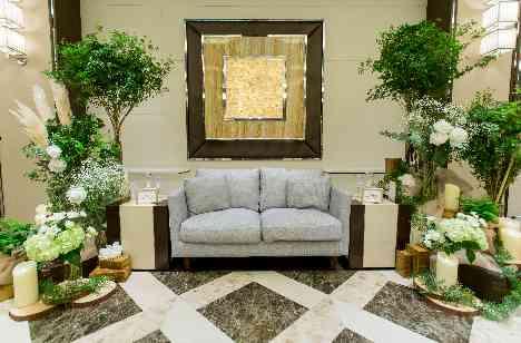 ご披露宴会場のコーディネートは高砂ではなくメインソファでオシャレにご用意いたしました。 メインカラーはグリーン基調で切り株やキャンドル等も飾りに付けてナチュラル感たっぷりの会場へと仕上がりました♪ゲストの皆さまとも気軽にたくさんお写真が撮れるようにとオシャレな仕上がりとなり当日はたくさんのゲストの皆さまと歓談やお写真タイムを過ごしておりました。