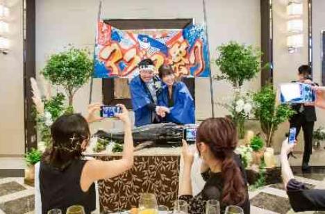 ご披露宴の際中でもおふたりはゲストを驚かせようとおふたりからのBigSurprise第2弾!!ケーキ入刀ならぬマグロ入刀!!当館のシェフが大きなマグロを運んでいただきました。 おふたりはそのマグロで入刀セレモニーを行いファーストバイトもマグロのお寿司で食べさせ合いました!(^^)! ゲストもなかなか見たことないシチュエーションに驚きたくさんお写真も撮っていただきながら楽しんでおりました♪