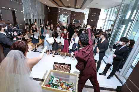 挙式が無事に結んでからもお二人のおもてなし&サプライズは続きます♪ なんと!アフターセレモニーとしてご用意されていたのは・・・名古屋名物のお菓子まき☆ お二人はもちろんのこと、ゲストもこの日イチの大盛り上がり♡ 全天候型式場のラグナヴェール名古屋だからこそ、館内完結で快適にお菓子まきが出来ました~♪
