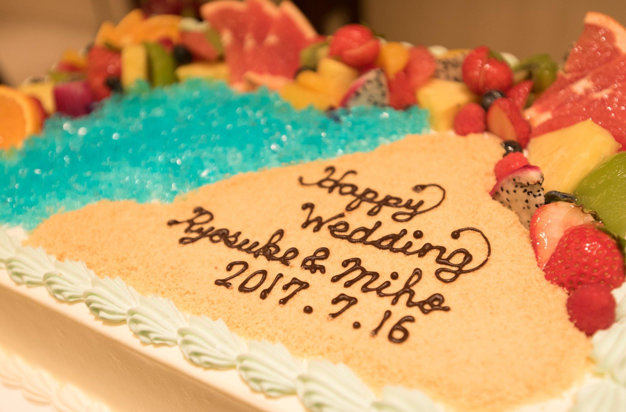 ケーキもリゾート感が出るように作成。 夏らしく沢山のフルーツを乗せ、 色は、さわやかなブルーも取り入れました! 沢山のゲストの方がケーキのお写真を 残されていました!