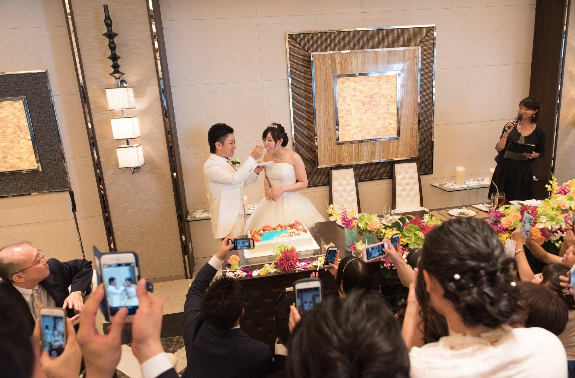 沢山のご友人にかこまれながらファーストバイト。 リゾート感溢れるケーキと会場のコーディネートの 相性も抜群です☆ ご新郎様はご自前の骨スプーンでファーストバイトを! 会場内は大盛り上がりでした!