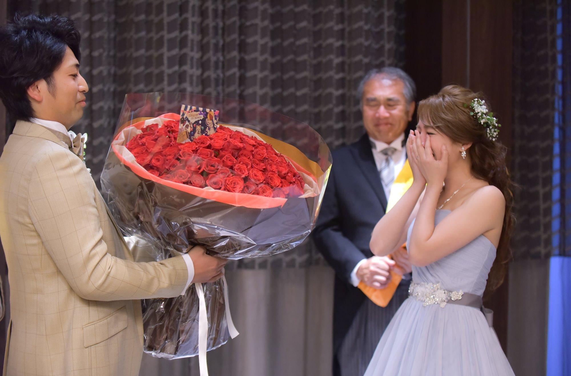 ご新郎様は、サプライズで”結婚して下さい”という意味の込められた真っ赤な108本のバラの花束をご用意!!!普段仲が良いお2人だからこそ、伝えられない想いを花束に込めました。