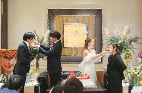 お2人のケーキ入刀が終え、その後ファーストバイトを♡ ご新婦様へは小さめなスプーンでご新郎様へは大きいスプーンで会場が盛り上がりました。 その後司会者から「二人には感謝を伝えたい方がいらっしゃるんですよね」とのお言葉 その後にお2人からゲストの方のお名前を呼びサプライズサンクスバイトを行いました♡ゲストの方からはびっくりの表情と笑顔が、、