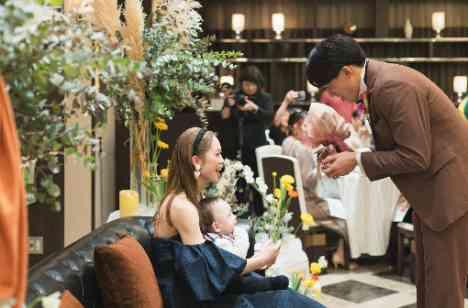 ご新郎様友人からのダンスのご余興が! 皆様盛り上がられており、曲の2番が始まると余興者皆様がご新郎様の元へ、、、その後ご新郎様がゲストの前でダンスを踊られご新婦様はかなりびっくりされていました。 サプライズはそれだけではなく、ダンス終盤お花束をもってご新婦様へプレゼント♡ご新郎様と余興者が考えられたサプライズにご新婦様からは笑顔が☺