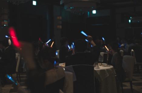 披露宴の後半にはゲストの皆様参加型のドレス色当てクイズを行いました。 ご新婦様のドレスは何色かとゲストの皆様もそわそわ♡ 当日はドレスの色だと思うサイリウムを振っていただき、 お2人そしてお子様と一緒に入場された時にはゲストの皆様からの歓声が上がっており、正解者の中から抽選で6名様にプレゼントをお渡しされておりました!!!!