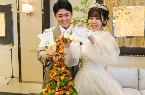 パーティが進み、いよいよケーキ入刀のお時間。 しかし運ばれてきたのは、なんとからあげのタワー!! まさかの登場に会場からも驚きの声が! そして入刀ではなく、お二人でタワーの上に旗を指して完成へ♡ ファーストバイトはもちろん唐揚げで☆ 結婚式で見られるいつもの光景とは違ったシーンに会場も大盛り上がりでした♪