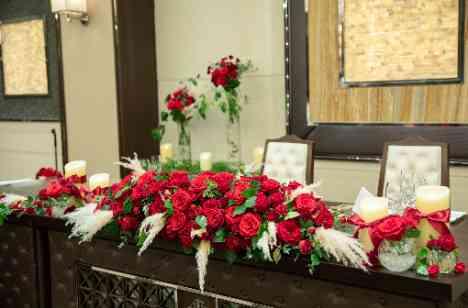 お色直しの衣裳がシックなグレー&黒ということもあり、会場は赤のバラが主役の華やかな装花となりました。 ブーケには生花とドライをミックスしたトレンド感あるクラッチブーケを取り入れ、秋らしさもプラス☆ 結婚式に対してイメージがあまり無いお2人でしたが、ゲストの皆様を想いお打ち合わせの際は一生懸命相談しながらご決定をされたコーディネート。 華やかなとても素敵な空間となりました♡