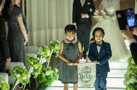 フラッグボーイ&ガールとともにお二人がご入場! フラッグを持ってるお子様たちは緊張気味に皆様の前を歩きます。緊張しながらもしっかりとバージンロードを歩き、お二人を先導してくれました☆そんな姿にゲストからは笑顔がこばれます。 皆様が笑顔になる様子がとてもあたたかく、すてきな挙式のお時間となりました。