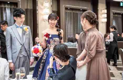 お色直しのお仕度が整い、お二人が再入場!! 扉がオープンすると、素敵な和ドレスに会場からも「きれ~!!」「素敵♡」と歓声が上がります☆ そのまま各卓でフォトタイムを楽しまれた皆様♪ お二人と近くで歓談も楽しまれ、自然と笑顔が溢れます♡ リラックスした自然な表情で思い出に残る素敵な一瞬を撮影することができました☆
