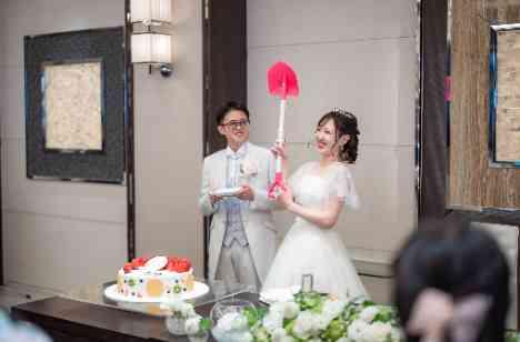 披露宴演出の定番「ファーストバイト」には、新郎様から新婦様への一口は「一生食べ物に困らせないよ」、新婦様から新郎様への一口は「一生美味しいご飯を作るね」という意味が込められています。また、食べさせるケーキの大きさは愛の大きさとも言われています。新婦様からご新郎様へは大きなピンクのスコップを使って、たっぷりの生クリームといちごを食べさせてあげていました。お二人の楽しそうな表情にまわりも思わず笑顔に♡
