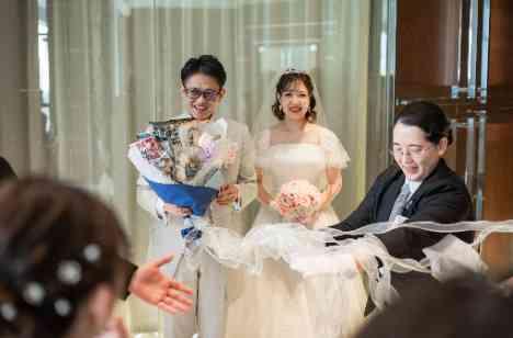 ご新郎様の手には豪華なお菓子の大きなブーケが有り、そこから何本ものリボンが伸びています。この中の1本がブーケにつながっていますので、そのリボンを引くと見事お菓子ブーケをGET!ブーケプルズというと新婦側のゲストに向けた演出としてお花で行うことが多いですが、新郎側のゲストにも楽しんで欲しいとこの演出をお選びいただきました!もちろん、新婦側のゲストにもブーケプルズは楽しんでいただいています!