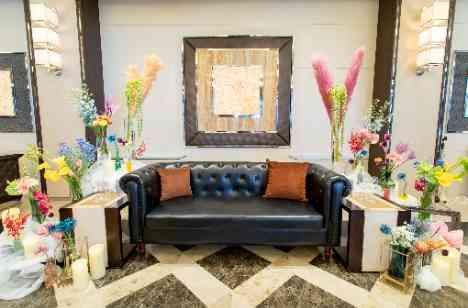お花が好きなお二人がこだわった会場のテーマは「カラフルポップなヨーロッパシティ風」 メインソファのサイドにも色の付いた花瓶やキャンドル、フレームも取り入れより華やかな雰囲気に。パンパスグラスやアンスリウム、カラーなど存在感のあるカラフルなお花がお写真映え間違いなしです♡ ゲストテーブルのカラフルな小瓶やブルーのテーブルランナーもこだわりのポイントです!