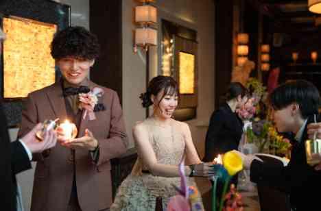 キャンドルリレーとは、新郎新婦様がキャンドルの火種を持ちゲストのテーブルを順番に周ってテーブルの代表者に火の灯を受け継ぎ、キャンドルの火をつないでいくゲスト参加型の演出です。会場の照明が落ちて、手元で灯るキャンドルの明かりはとても幻想的で特別な気分に♪「キャンドルの数だけ天使が舞い降りる」という言い伝えに由来し、参加者全員が幸せになるように願いを込めて行います♡