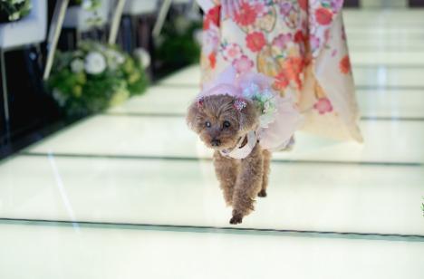 ご新婦様の実家で飼われている愛犬のトイプードルの女の子がリングドックを務めます!可愛いピンクのフリルのついたお洋服を着て、両耳の辺りにはヘアアクセサリーもつけておめかしはばっちり!背中にお二人の誓いの指輪を背負ってバージンロードを進んでいきます。ご新婦様の妹様にも後ろからフォローいただきながら無事にお二人のもとへ指輪を届けることが出来ました♪一生懸命な姿にゲストも思わず笑顔に。