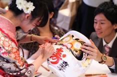 和のテイストと洋のテイストを掛け合わせで装飾も用意しました。 ロビーではだるまにメッセージを書き込んで頂き、パーティー内でだるまの目入れのセレモニーを行いました!お料理には名古屋名物『ひつまぶし』とイタリアの『リゾット』の融合メニューが登場。ありそうでなかった組み合わせにゲストは大満足★