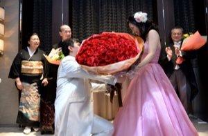 ゲストの皆様の為にと頑張って準備を進めた唯さん、楽しい雰囲気が好きなので、『結婚式は泣かないだろうな』とおっしゃっておりましたが、ここで孝太郎さんから赤い薔薇108本の花束をプレゼント!一人では抱えきれないほどの大きさの花束を受け取り、涙される唯さん。会場内からは歓声が上がるとても素敵なワンシーンでした。孝太郎さん!大成功でしたね!