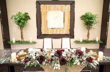 会場装花に特にこだわってくださったおふたり。フラワーコーディネーターとお打合せを重ね、パンパスやドライフラワーをあしらった季節感のあるコーディネートに♪ウェルカムスペースには、ご新婦様こだわりのゴールドのアイテムを中心にお洒落なグッズをご用意頂きました。