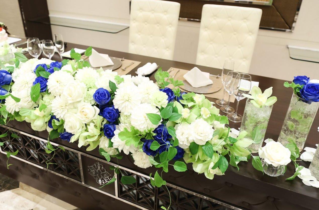 新婦様の鮮やかなブルーのカラードレスに合わせて、メインテーブルにも青いバラを配色。お色直し後のドレスとの一体感をイメージしております!ブーケもこだわってトータルコーディネートを意識!