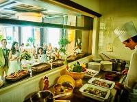 パーティ会場はオープンキッチン付。シェフの臨場感あふれるライブ演出が楽しめるほか、アツアツのお料理をベストなタイミングでゲストのもとにお届けできる。お料理は、幅広い年齢層に好評のフレンチジャポネ。和の要素が加わったホっとする味わいが人気。
