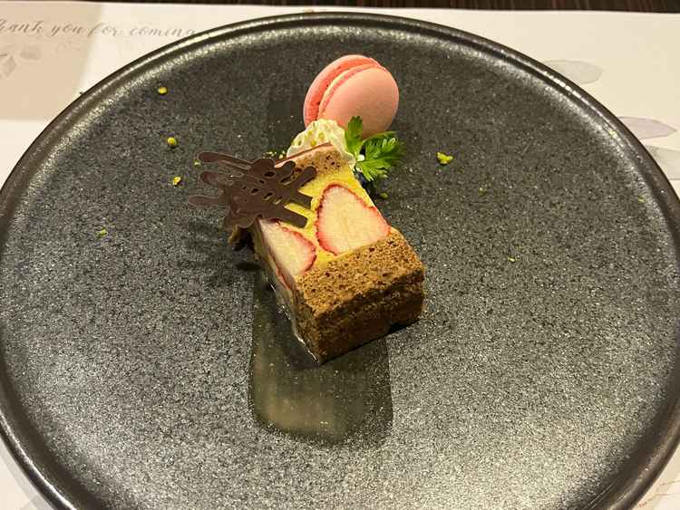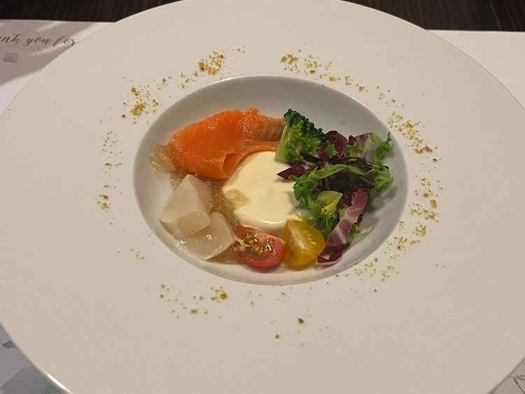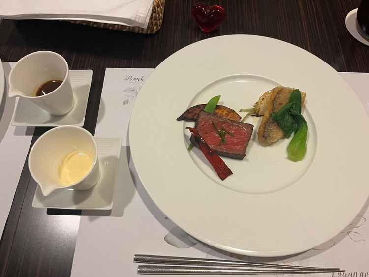 和テイストのフレンチコースで味が濃過ぎず、箸でも食べられるのがよかった。試食時は銀色の箸だったのでカチャカチャするのが気になった。お肉が少し硬い気がしたが、18000円くらいのコースの料理と言われたので、コスパはあまり良くないと思う。