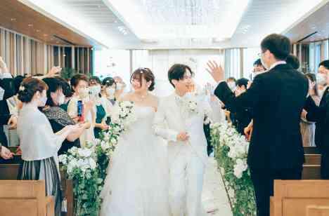 おふたりの屋上撮影が結び、いよいよ挙式がスタートします! マザーズロードをお母様と歩いた新婦様は、お父様にエスコートチェンジをし、新郎様の元まで歩きました。 新しい夫婦の愛を誓ったおふたりは、ゲストの皆様からフラワーシャワーで祝福を受け、明るい未来に向かっておふたりご一緒にご退場されました。 新郎様はご友人様とハイタッチしながらのご退場でした!