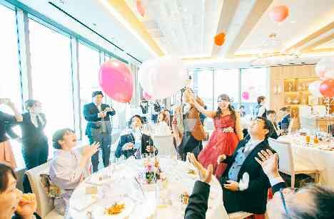 お色直しの再入場でおふたりが選んだ演出は 【バルーンスパーク】でした。 バルーンスパークとは、お色直しの再入場の際におふたりが各テーブルを回り、バルーンを割る人気の演出です。 バルーンを割ると中から沢山のバルーンが飛び出し、ゲストの皆様が大盛り上がりします。 おふたりの共同作業ということもあり、皆様写真や動画を楽しそうに撮っていました。
