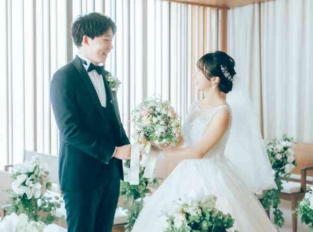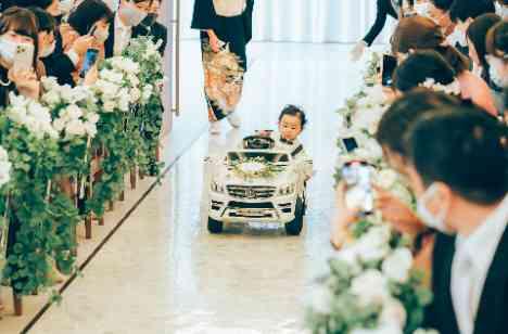 ロビーでのウェルカムパーティーが終わり、チャペルでの挙式がスタートしました。 新郎様が入場した後、新婦様はお母様とマザーズロードというオリジナルのバージンロードを歩き、入場します。 そしていよいよ指輪の交換という場面で、ラジコンカーに乗った可愛いお子様がおふたりの元へ指輪を運んでいきました。会場全体は何とも可愛らしい姿とゲストの方の優しい笑顔に包まれました。