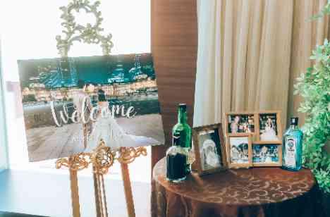 ゲストの皆様が会場に到着すると、まず目に入るものはおふたりがご自身で作成した「ウェルカムボード」です。 おふたりは東京駅で前撮りを行ったため、その素敵なお写真をウェルカムボードに使用して、ゲストの皆様をお迎えしました。 ウェルカムスペースには、おふたりが好きなお酒や他のお写真を置いて、おふたりらしいウェルカムスペースに仕上げています。