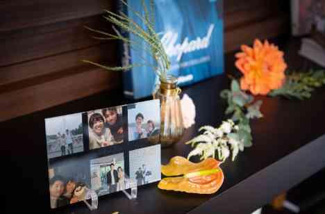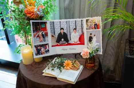新婦様のこだわりがつまった会場装花。 その花材とお揃いのコーディネートでお待合ロビーも装飾しました! 温かみがあり、オシャレな雰囲気のテラコッタカラーでおまとめいたしました。 お2人のお写真も一緒に装飾し、ゲストの皆様にも楽しんでいただきながらロビーでのお待合のお時間をお過ごしいただきました。
