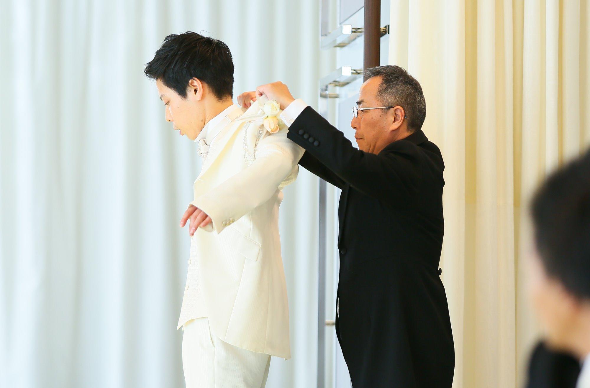 「新婦のお父様はエスコート、お母様はヴェールダウン、新郎のお母様は披露宴で登場…新郎のお父様って登場するところがないよね…」そんな会話から 「お父さんにジャケットを着させてもらうセレモニーをしたい!!」とお二人。 ご家族への絆に感激した打合せでした!! 当日もゲストの皆様に見守られてばっちりと決めてもらいとても温かいご家族の絆に包まれた挙式になりました❤ お父様と新郎様とても素敵でしたね!!