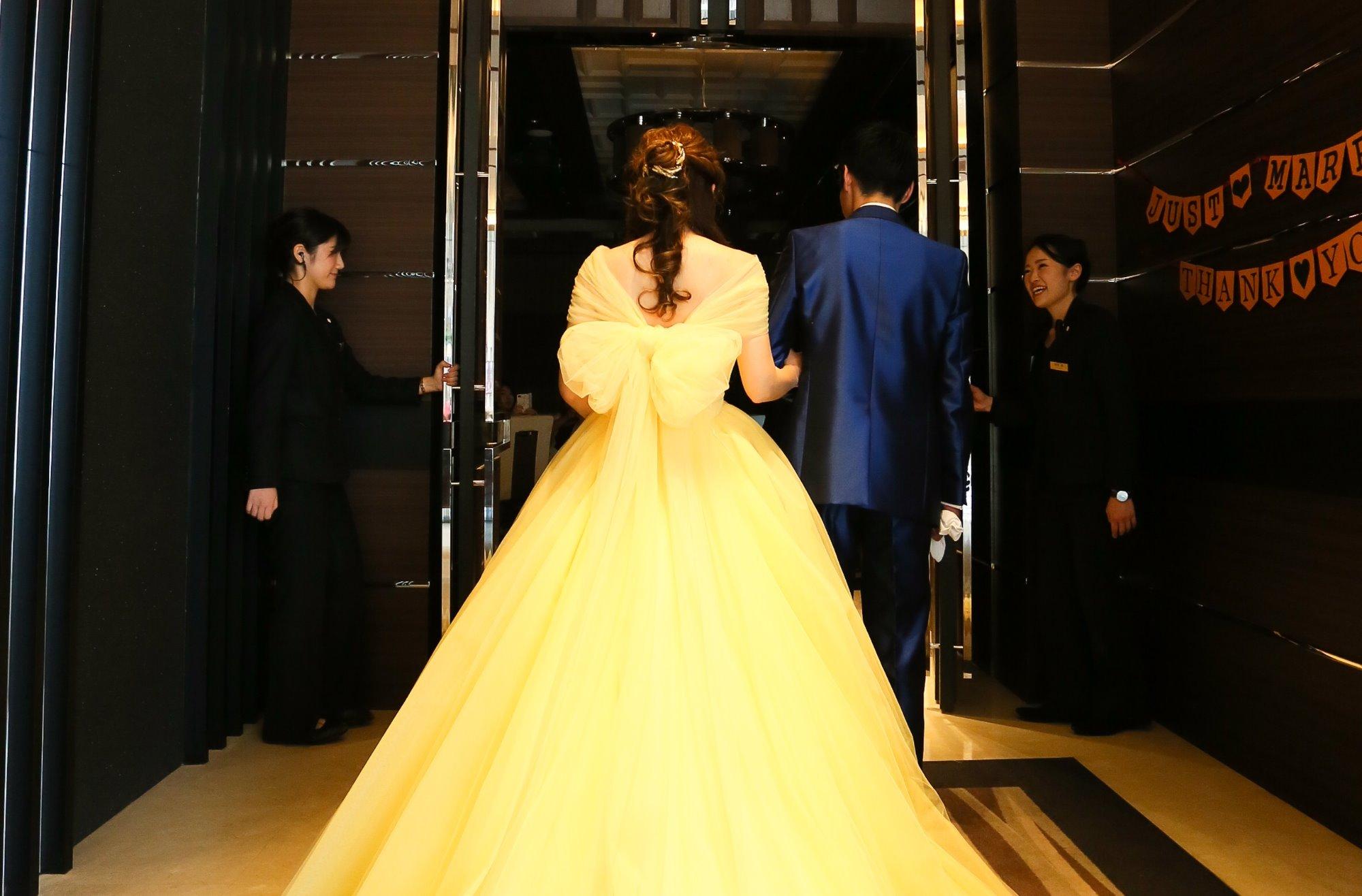 扉を開けた瞬間にひろがる美女と野獣の世界にゲストも大歓声❤ネイビーのテーブルクロスに赤いバラのお花を加えてとても上品な会場になりました。 もちろん再入場は黄色のドレスに身を包んだご新婦様とネイビーのタキシードを着たご新郎様が登場!! 会場スタッフも大盛り上がりで素敵な時間を共有させていただきました❤ …そして、お開き後の中央通りでのサプライズ。。 とても素敵でした!!!