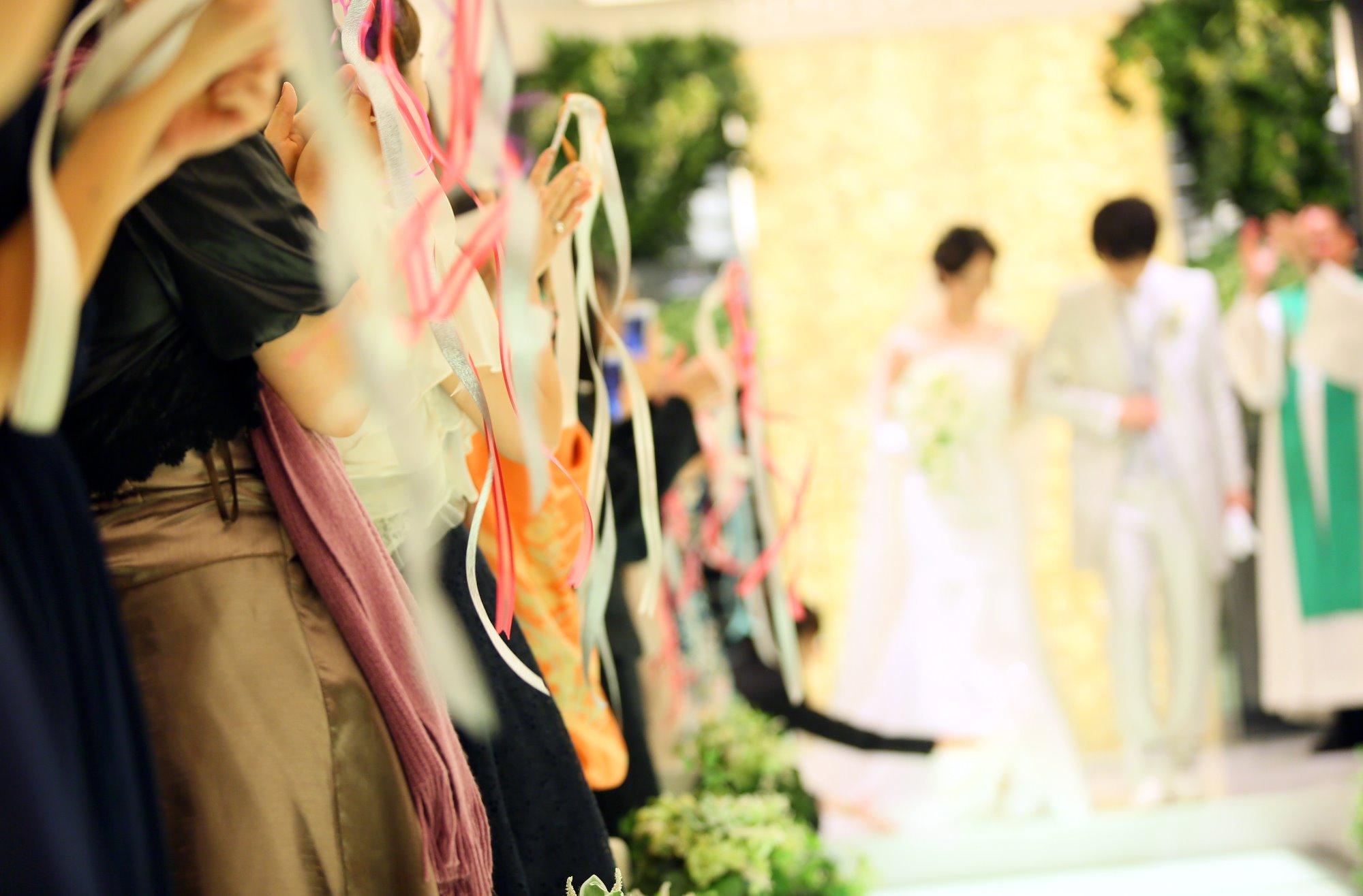 この日1日を通して活躍したのがリボンワンズ♪ 手作りで何と100本近く作ってくださいました!!! 受付でドレスの色当てクイズに合わせて3色のリボンワンズを選んでもらい、挙式では退場で祝福してもらい大活躍!! 披露宴でも色当てクイズで使って楽しんでもらいました…が! さらに、このアイテムにはお二人から秘密が! 当りの中にさらに1本大当たりを仕込むサプライズ♪ 皆様で盛り上がりました♪