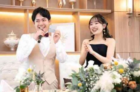堅苦しくなくて気軽に会話が弾むパーティをご希望のおふたりは、披露宴中にご友人スピーチやサンクスバイト等を取り入れ、ゲストが披露宴にご参加できる進行にされました。お色直し入場後は、受付で行ったクイズの正解発表やプレゼントのお渡しをされ、ゲスト様と近い距離で過ごせるアットホームなパーティを楽しまれました!