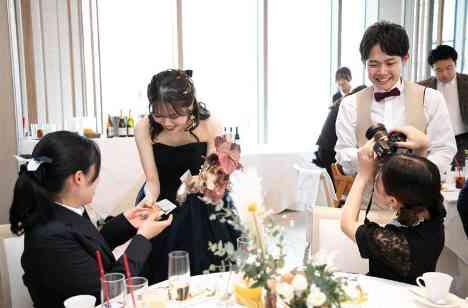 進行内に組み込んだテーブルラウンドでは、ラウンド中にゲストとお話が弾むように!とお菓子をお配りしながらのお菓子ラウンドで各テーブルを廻りゲストとの会話を楽しまれました。テーブルに到着すると、ゲスト様から写真撮りたい!とたくさんご要望いただき、おふたりもゲストも笑顔いっぱいのテーブルラウンドとなりました。披露宴の結びには新郎様から新婦様へのサプライズもあたたかく感動的なシーンでした ♡