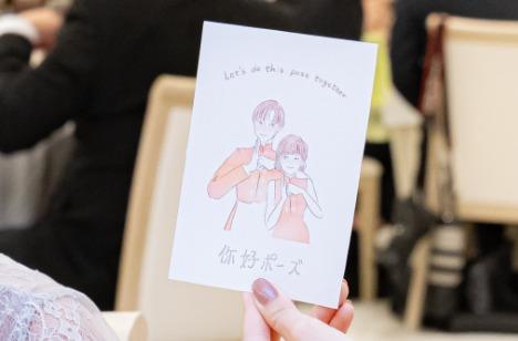 お色直しにオレンジのカラードレスと青のタキシードを選ばれ、華やかな雰囲気のお色直し入場後はゲストのテーブルを順番に周られたおふたり。おふたりの中座中に各卓代表の方に新婦手作りの「ポーズカード」をお選びいただき、カードに合わせたポーズで普段と違う表情のお写真を撮影されました。友人の皆様からの「おめでとう!」の声に迎えられ、歓談もまじえながらおふたりもリラックスした様子でご挨拶をされていました♪