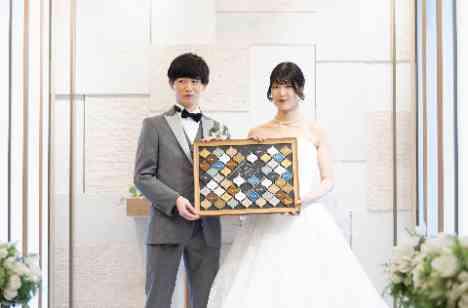 結婚証明書は、皆様のサインが記入されているウエディングタイルを選ばれたお二人。「二人の結婚式の証人になる」という皆様の想いが込められた世界に1つだけの結婚証明書☆最後はお二人がタイルをはめ、皆様の前で愛を誓い、完成となりました♡ ゲスト参加型の人前式は、皆様からの祝福をより一層感じることができ、一生の思い出となる素敵なお式となりました!