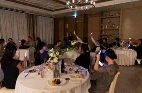 お色直しはカラードレスの色当てクイズを開催☆ 会場にご到着されたゲストの皆様は正解だと思う色のサイリウムを手に取り会場へ! そして再入場の時それぞれの色で輝くペンライトの中、お二人が入場!! お二人の素敵な姿と正解を目にした瞬間、歓声もあがり大盛り上がり! 色当てクイズは、パーティで盛り上がる演出の一つです☆ 楽しんでいるゲストの皆様の姿にお二人も笑顔が絶えない入場となりました!