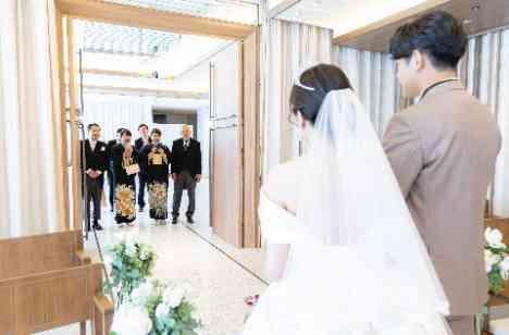 お式前にご家族との時間を過ごしたいという想いからファミリーミートを企画したお二人。 チャペルにスタンバイし、皆様が到着されると合図とともにチャペルの扉がオープン!! 大切なご家族の皆様に、晴れ姿を1番最初にお披露目☆お二人の姿を見た皆様は今までの思い出を振り返りながら、大切な時間を過ごされていました。