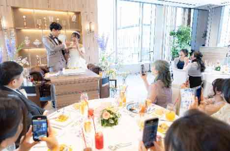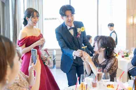 お色直し再入場後、お二人のテーブルラウンドがスタート☆ そして、お二人から感謝の気持ちを込めて、フラワーサーブの演出がおこなわれました。 ひとりひとりに1輪のガーベラを想いを込めてお渡ししていくお二人。 歓談や各卓でのお写真も楽しまれ、皆様自然と笑顔が溢れます♡ 和やかな雰囲気でパーティは進んでいきました。