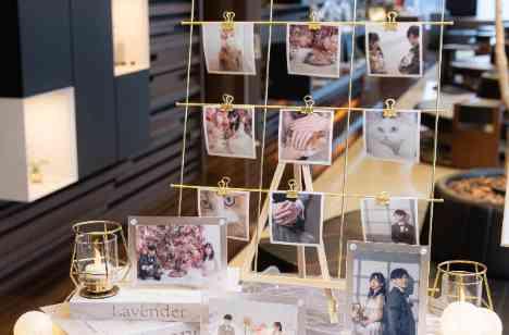 挙式までの時間、ゲストの皆様にゆったりとお過ごしいただくロビーにはたくさんの写真を装飾。新郎新婦様が出会われてから8年間の思い出の写真に、時にはご友人様も懐かしみ様子が見られたり、ご自身のカメラで撮影されている方もいらっしゃいました。これから始まる挙式に向けて、ハレの日を迎えたおふたりの姿を早く見たい!と、ワクワクをもっと膨らませてくれるウェルカムスペースでした♡