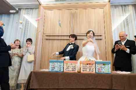 挙式を結んだ後のアフターセレモニーでは、全員での集合写真撮影と、お菓子まきを進行に取り入れました♡幸せのおすそ分けの意味もあるお菓子まきでは、掛け声と共に新郎新婦様がゲストに向けてお菓子をばらまき、ゲスト皆様もそのお菓子をキャッチしようと会場全体が大盛り上がり♪ご親族様もご友人様も、幅広い世代の皆様に楽しんでいただきたいと考えられた、楽しく印象的なイベントでした♡