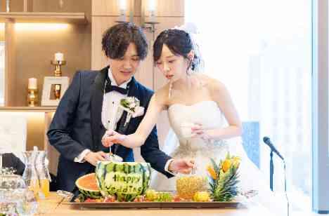 新郎新婦様が出会われたのは大学生時代の真夏のBBQイベント♡そんな思い出を大切に自分達らしいことをしたいと、ウェディングケーキではなく涼しさを感じさせるフルーツポンチセレモニーを企画♪登場したスイカとメロンにおふたりがフルーツやサイダーを入れ、皆様の前でフルーツポンチを作られました。珍しさと見た目の可愛さ・楽しさを兼ね備えたオリジナリティ溢れるセレモニーですね…♡