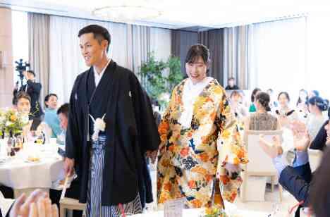 お色直しでは、新婦様が学生時代お世話になった恩師の方への感謝の気持ちも込めて、煌びやかな和装を選ばれました。扉が開いた瞬間、和装姿の新郎新婦様にゲストから歓声が沸き起こり、皆様が注目される中ゆっくりとご入場を。オレンジ色をメインに作られた会場内の装花と、新婦様の華やかな色打掛がマッチし、会場全体のコーディネートもよりお洒落になりました♡