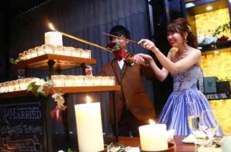 後半はキャンドルをふんだんに使ってキャンドルの幻想的な空間を演出。 ゲストの皆様へお二人からのキャンドルリレーのプレゼント。一つ一つ会場にキャンドルの明かりが灯っていきます。 お二人のメインキャンドルには魔法をかけて素敵なひと時を演出。