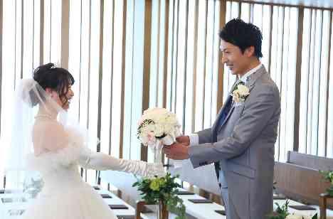 新婦様のウエディング姿をとっても楽しみにしていた新郎様♪ ご結婚式当日は、ファーストミートをすることに致しました♡ チャペルにいらっしゃる新婦様に後ろからお声がけする新郎様♪ 一段と美しいウエディング姿の新婦様に新郎様がお花をお贈りしている瞬間でございます…*