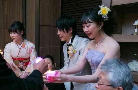 キャンドルには天使が宿っており 一斉に吹き消すと願いが叶うと言われております。 キャンドルの灯火をゲスト一人一人に お裾分けするお二人♪ 火が灯ると七色に光るキャンドルは 会場の雰囲気もいっそうロマンチックになりました♡