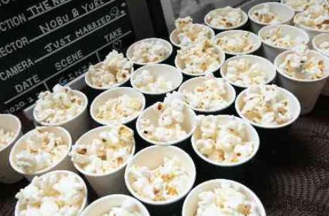 ゲストはポップコーン片手に披露宴会場へ♪ 映画撮影には欠かせないカチンコが各テーブルに!! カチンコにはテーブルナンバーが書かれているという アイデア満載なこだわり空間♡ いよいよお二人のこだわりがつまった披露宴が 上映されます♪