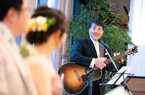 余興ではギターで歌のプレゼント。 この日のためにご用意した 素敵な歌のプレゼントに一段とご披露宴の 雰囲気が和やかになりました♪ 新郎新婦のお二人は、歌のプレゼントに とってもうれしそうでございました!