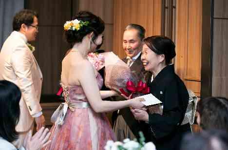 ご披露宴の結びにはお二人から親御様へ お手紙とお花束のプレゼント。 ご結婚式当日まで大切に育てていただいた 感謝のお言葉に、思わずゲストの目にも涙が溢れました! お二人からの親御様への愛が伝わったお時間でございました♪