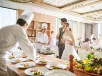 少人数の結婚式だからこそお料理は重視したい!フレンチと和を融合したフレンチジャポネをシェフを貸切って最高の料理を堪能できる*当日のサービスも◎チャペルには自然光が差し込み、頭上にクリスタルが輝く開放的